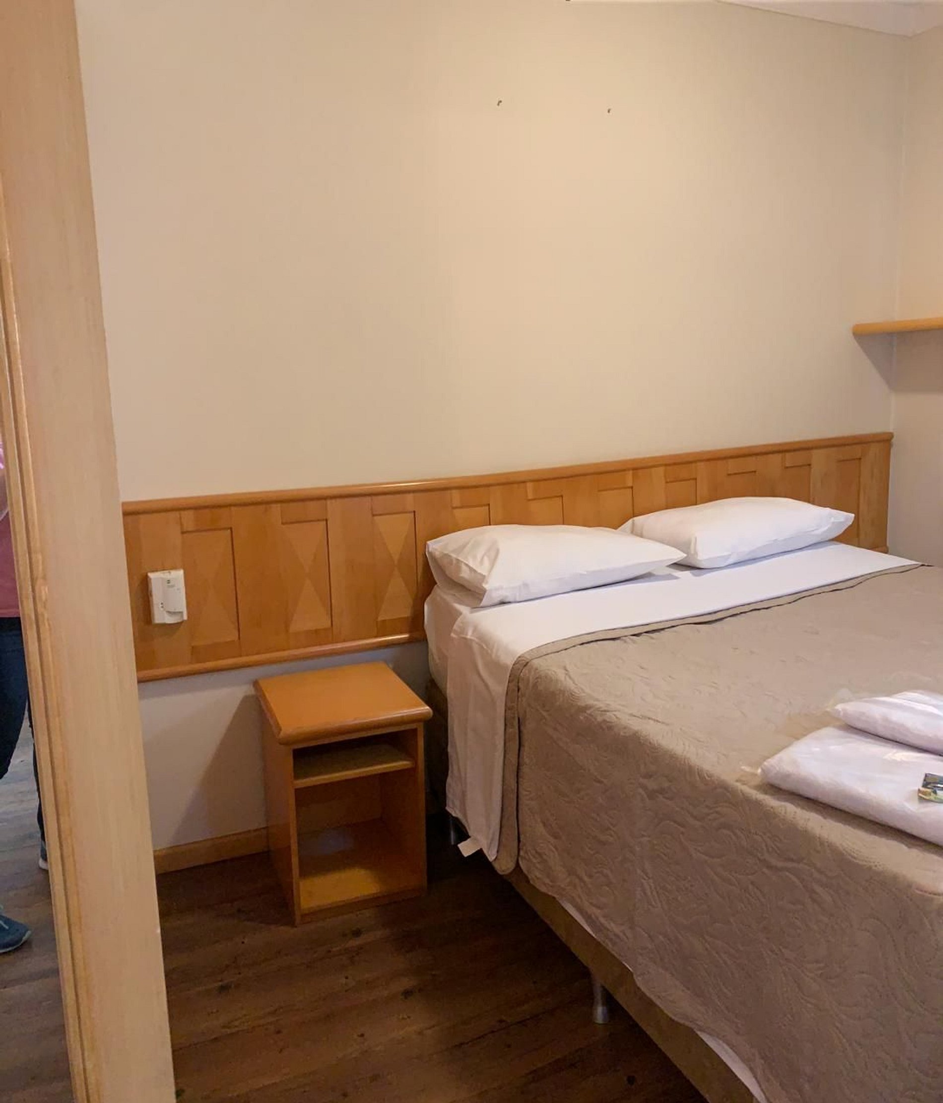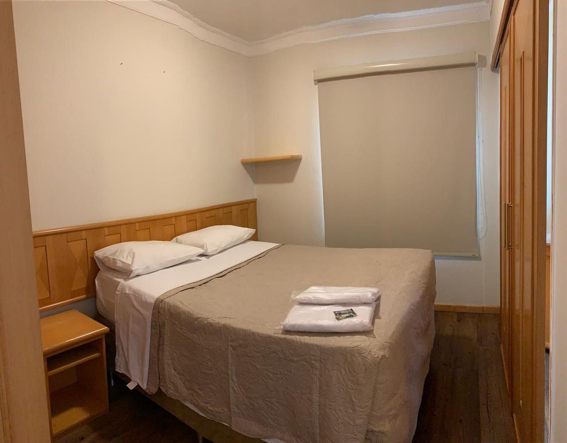 Os quartos têm decoração moderna e prática, TV a cabo e frigobar.